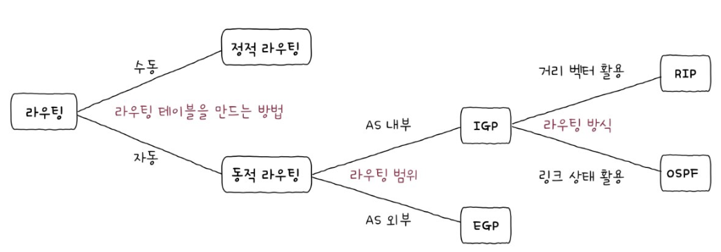 - 동적 라우팅 : 라우팅 프로토콜을 통해 자동으로 채워진 라우팅 테이블 항목을 토대로 라우팅되는 방식