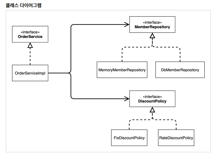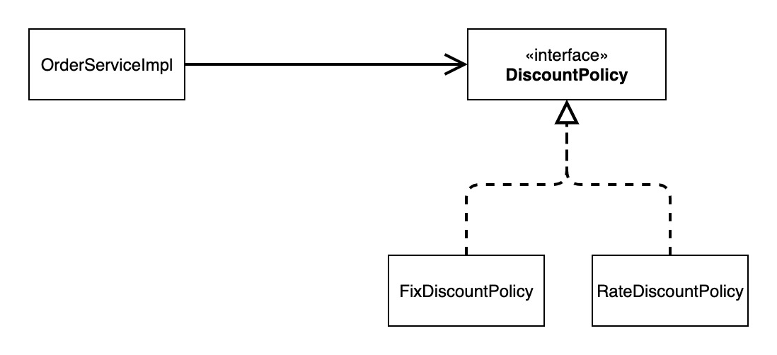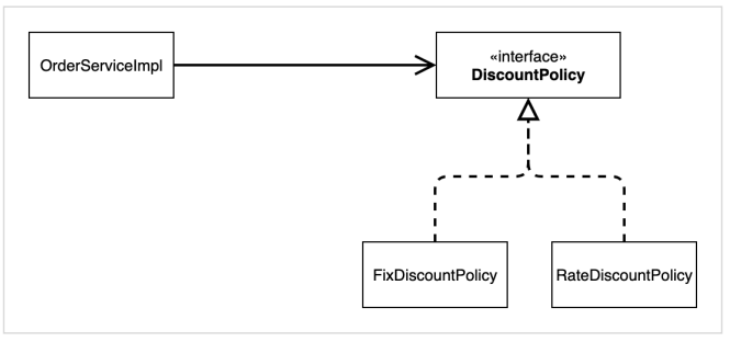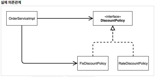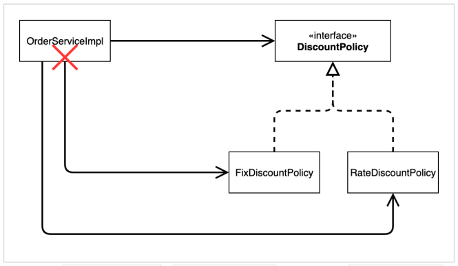 - DIP 위반 -> 추상(인터페이스) 뿐만 아니라 구체(구현) 클래스에도 의존하고 있다. 추상(인터페이스) 의존: DiscountPolicy 구체(구현) 클래스: FixDiscountPolicy , RateDiscountPolicy