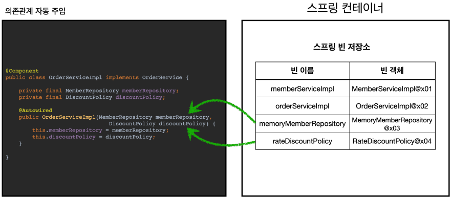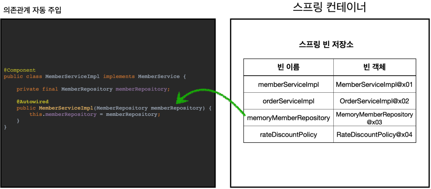 스프링 컨테이너가 자동으로 타입이 같은 빈을 찾아서 주입한다.