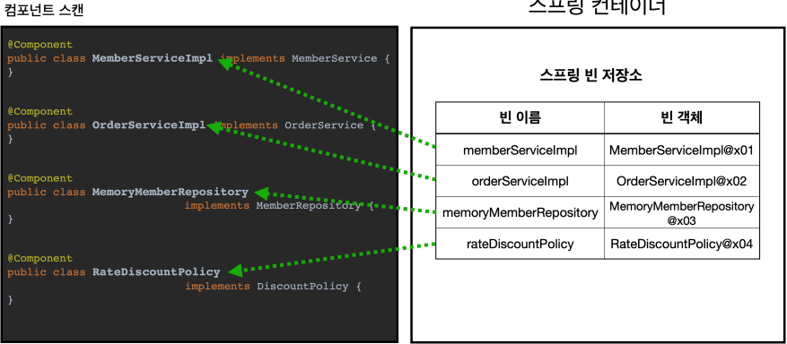 - @ComponentScan은 @Component가 붙은 모든 클래스를 스프링 빈으로 등록한다.