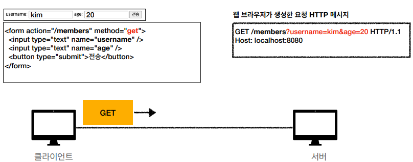 - get method로 된 Form 태그의 submit 버튼을 누르면, 웹 브라우저가 HTML Form의 데이터를 읽어서 HTTP 요청 메시지를 생성해준다.