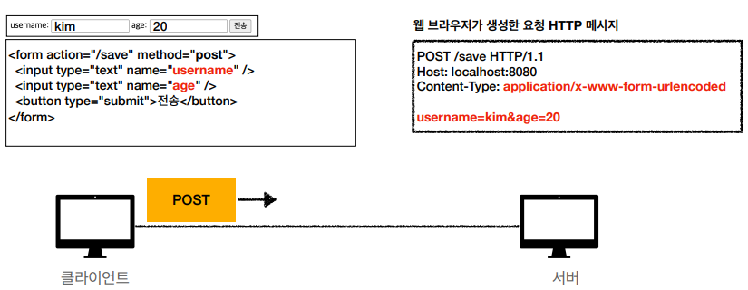 - post method로 된 Form 태그의 submit 버튼을 누르면, 웹 브라우저가 HTML Form의 데이터를 읽어서 HTTP 요청 메시지를 생성한다.