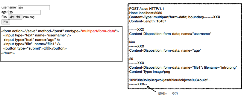 - HTML Form 태그의 enctype="multipart/form-data"로 설정하고 submit 버튼을 누르면 웹 브라우저가 username, age, file1 데이터를 분리하여 message-body에 담아 HTTP 요청 메시지를 생성해준다.