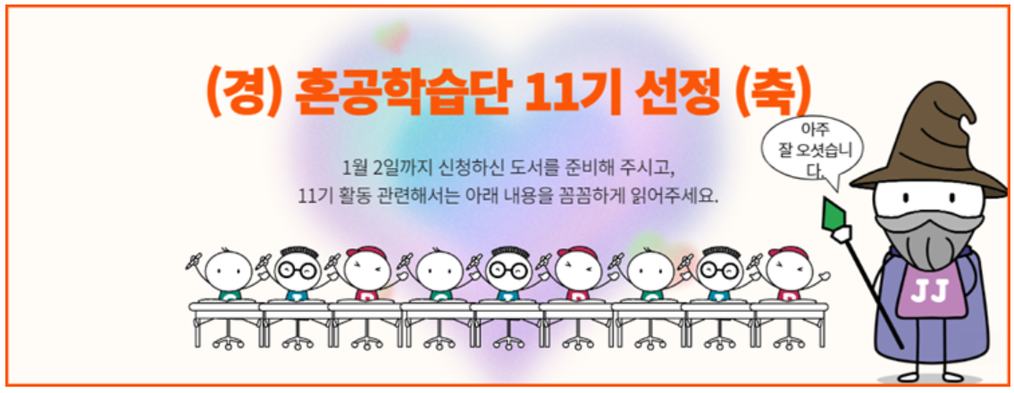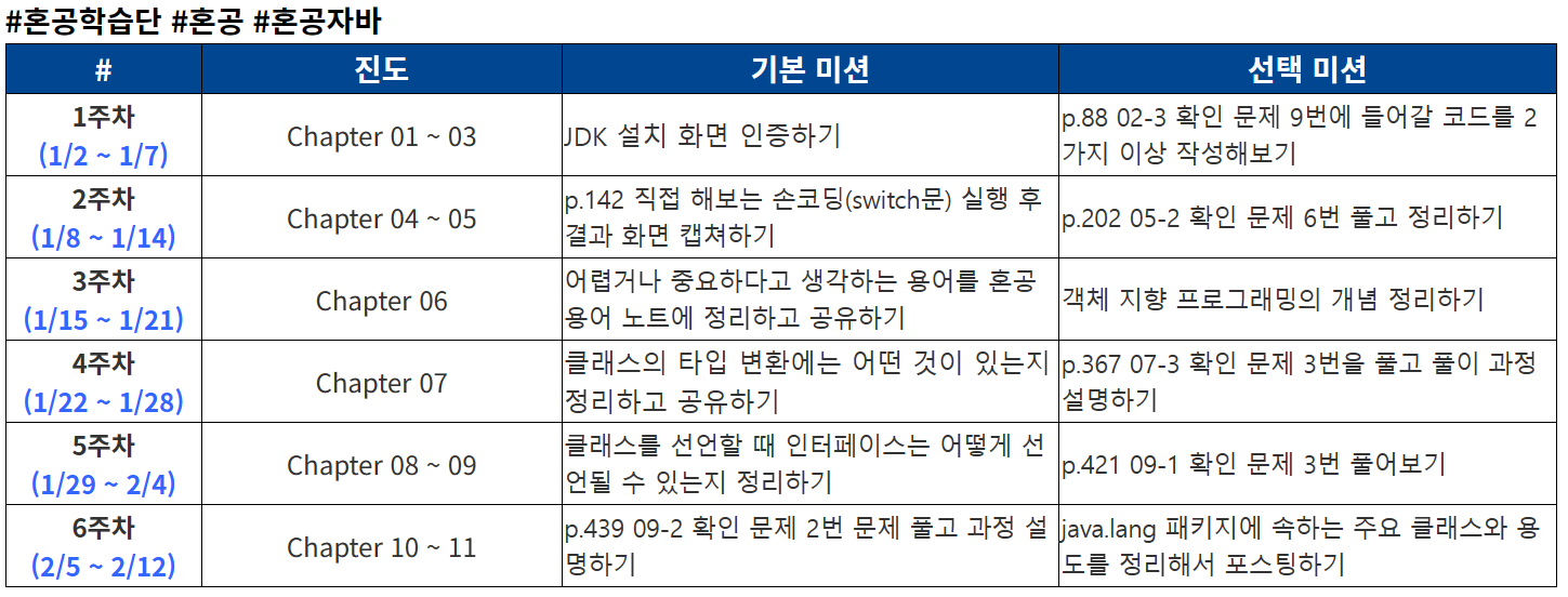 11기로 선정이 되어 처음으로 혼공학습단 활동을 시작하게 되었다. 교재로 '혼자 공부하는 자바'를 선택했으며, 아래와 같은 커리큘럼으로 6주 동안 달려보도록 하겠다.