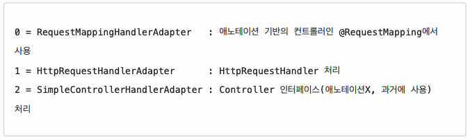 - 핸들러 어댑터: org.springframework.web.servlet.HandlerAdapter