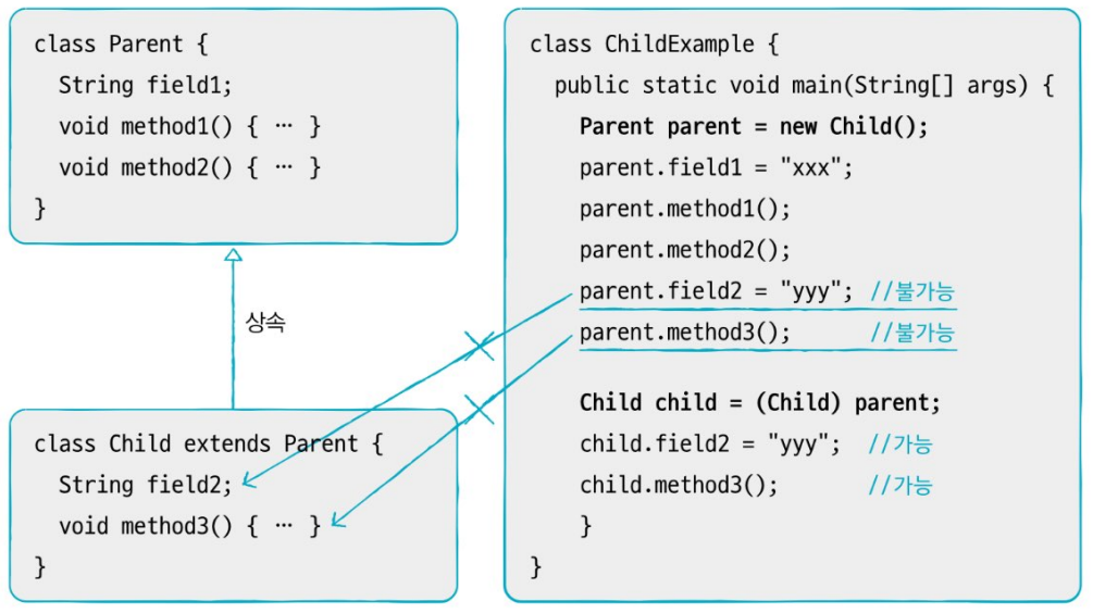 부모 타입으로 자동 타입 변환된 이후에는 부모 클래스에 선언된 필드와 메소드만 접근 가능하다. 단, 메소드가 자식 클래스에서 재정의되었다면 자식 클래스의 메소드가 대신 호출된다.