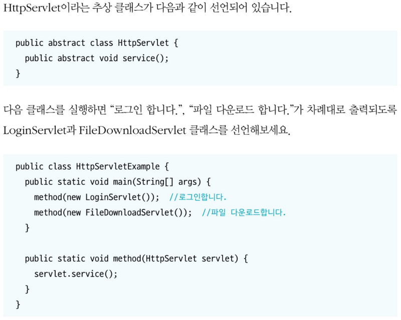 메소드의 선언만 통일하고, 실행 내용은 실체 클래스마다 달라야 하는 경우가 있다. 이런 경우를 위해 추상 클래스는 다음과 같이 추상 메소드를 선언할 수 있다. 자식 클래스는 반드시 추상 메소드를 재정의해서 실행 내용을 작성해야 하는데, 그렇지 않으면 컴파일 에러가 발생한다.