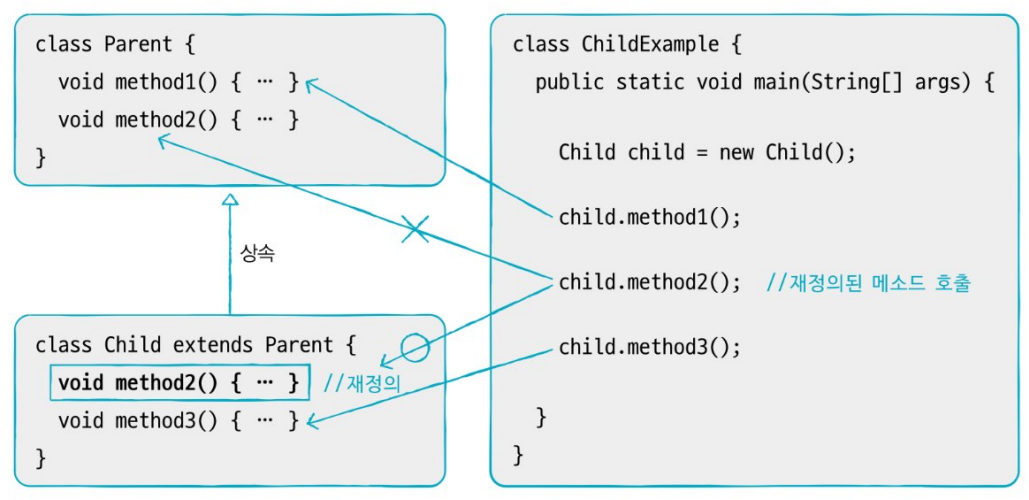 - 부모의 메소드와 동일한 시그니처(리턴 타입, 메소드 이름, 매개 변수 목록)를 가져야 한다.