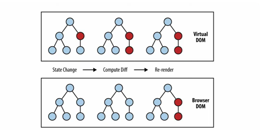 - Virtual DOM은 변경된 부분을 계산 후 변경하고, 해당 부분만을 다시 Rendering한다.