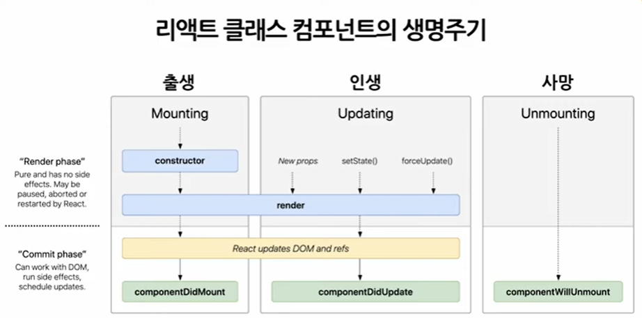 - Component는 계속 존재하는 것이 아니라, 시간의 흐름에 따라 생성되고 업데이트 되다가 사라진다.