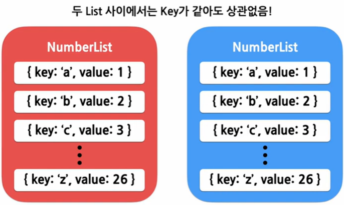 - key의 값은 같은 리스트에 있는 elements 사이에서만 고유한 값이면 된다.