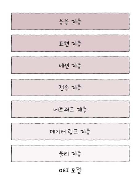 - 물리 계층, 데이터 링크 계층, 네트워크 계층, 전송 계층, 세션 계층, 표현 계층, 응용 계층