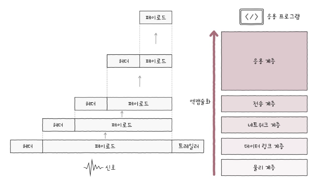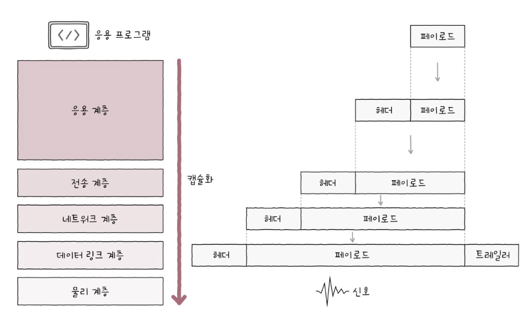 - 상위 계층으로부터 내려받은 패킷을 페이로드로 삼아, 프로토콜에 걸맞은 헤더/트레일러를 덧붙여 하위 계층으로 전달