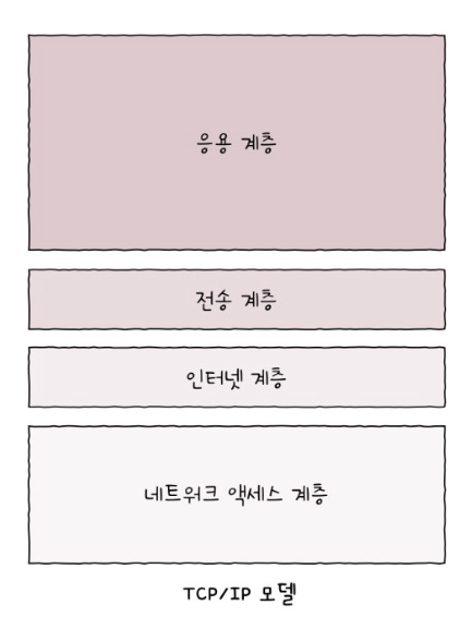 - 네트워크 액세스 계층, 인터넷 계층, 전송 계층, 응용 계층