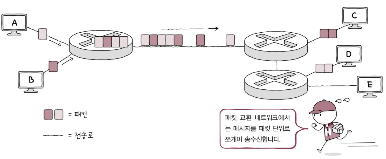 - 메시지를 패킷이라는 작은 단위로 쪼개어 전송