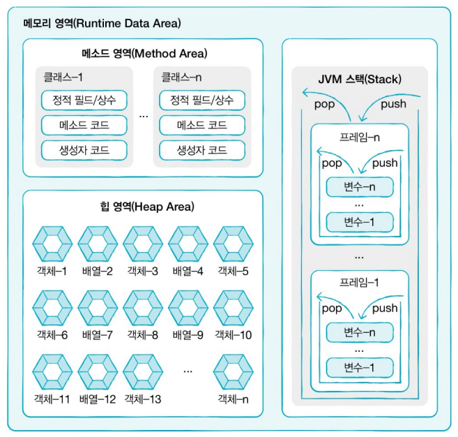 - 클래스별로 정적 필드와 상수, 메소드 코드, 생성자 코드 등을 분류해서 저장한다.