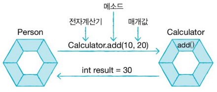 메소드 호출 코드는 다음과 같다. 객체의 상호작용은 객체 간의 메소드 호출을 의미하며 매개값과 리턴값을 통해서 데이터를 주고받는다.
