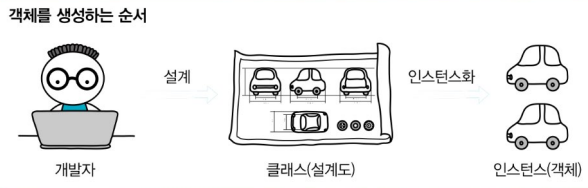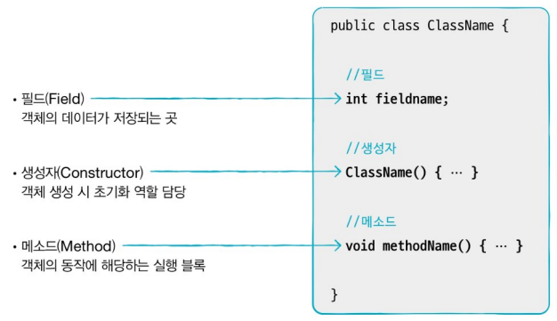 - 클래스 : 객체를 생성하기 위한 필드와 메소드가 정의되어 있는 설계도