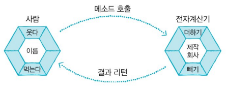 객체는 속성과 동작으로 구성되어 있으며, 자바는 속성을 필드, 동작을 메소드라고 부른다. 소프트웨어의 모든 현상은 객체와 객체 간의 상호작용으로 이루어지는데, 이때 객체가 다른 객체의 기능을 이용하는 것이 바로 메소드 호출이다.