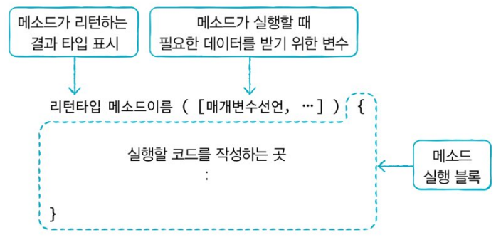 리턴값이 없는 메소드는 리턴 타입에 void로 기술하며, 리턴값이 있는 메소드는 리턴값의 타입을 기술한다.