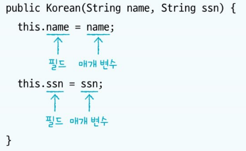 일반적으로 필드와 동일한 이름을 갖는 매개 변수를 사용한다. 그러나 이 경우 필드와 매개 변수 이름이 동일하기 때문에 생성자 내부에서 해당 필드에 접근할 수 없는 문제가 발생한다. 이를 해결하기 위해 필드 앞에 this를 붙여서 'this.필드'라는 참조 변수를 사용한다.